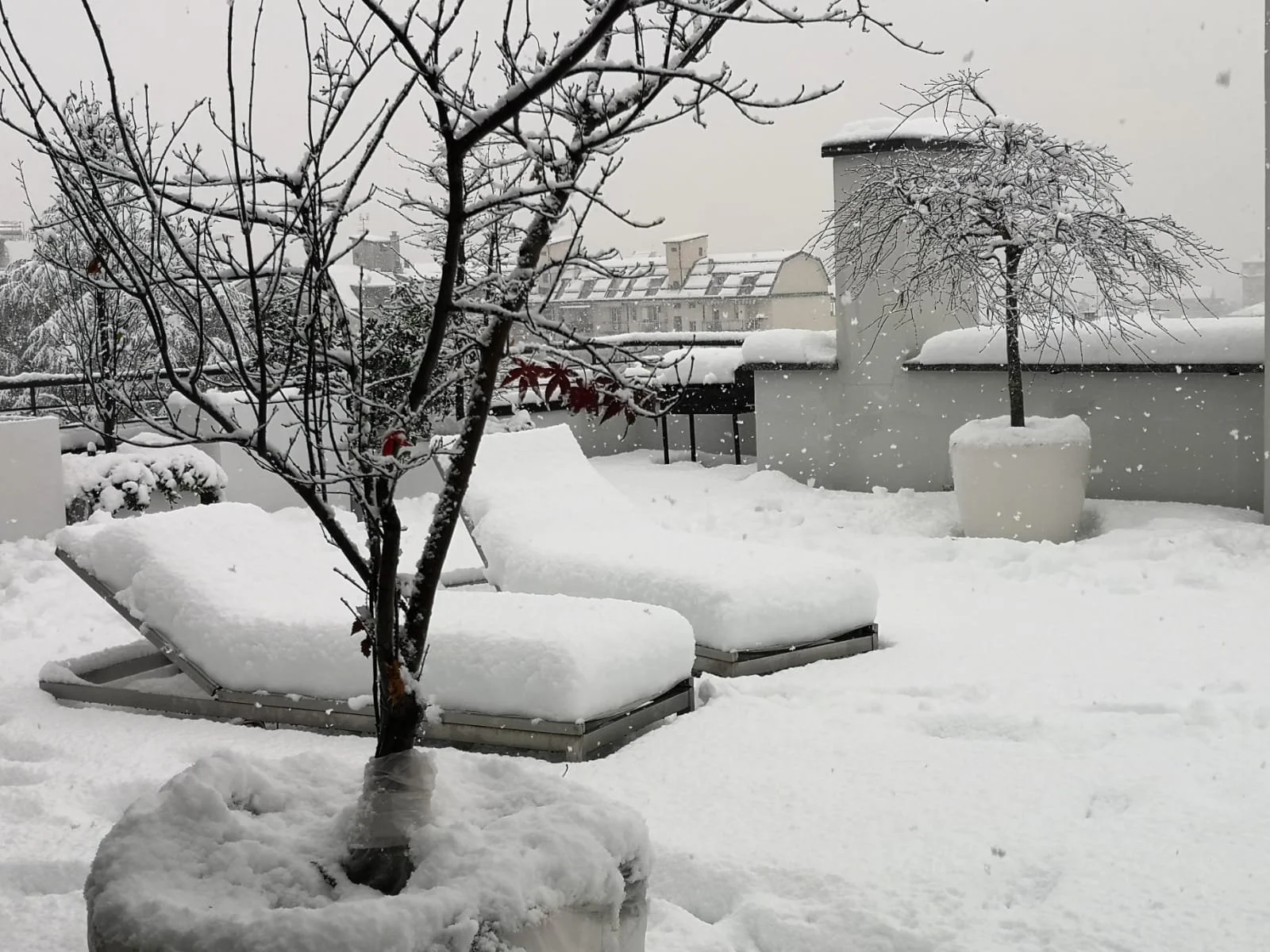 Tutte le strutture in vaso e i componenti d’arredo sono declinati nel colore bianco, per desiderio della committenza: una scelta che in inverno dialoga con la stagionalità e la presenza della neve, mentre in estate restituisce un’immagine di freschezza, luminosità ed equilibrio.
