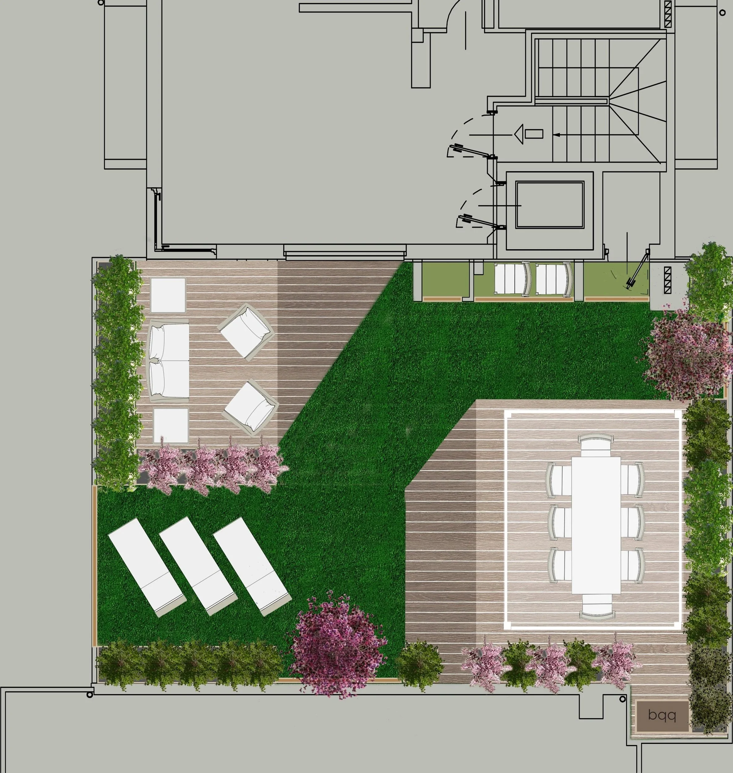 La zona salotto è caratterizzata dalla presenza di una struttura assimilabile a un piccolo gazebo vegetale, definito da glicine ed essenze profumate che accompagnano la sosta e il relax.