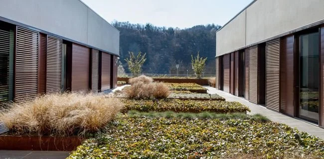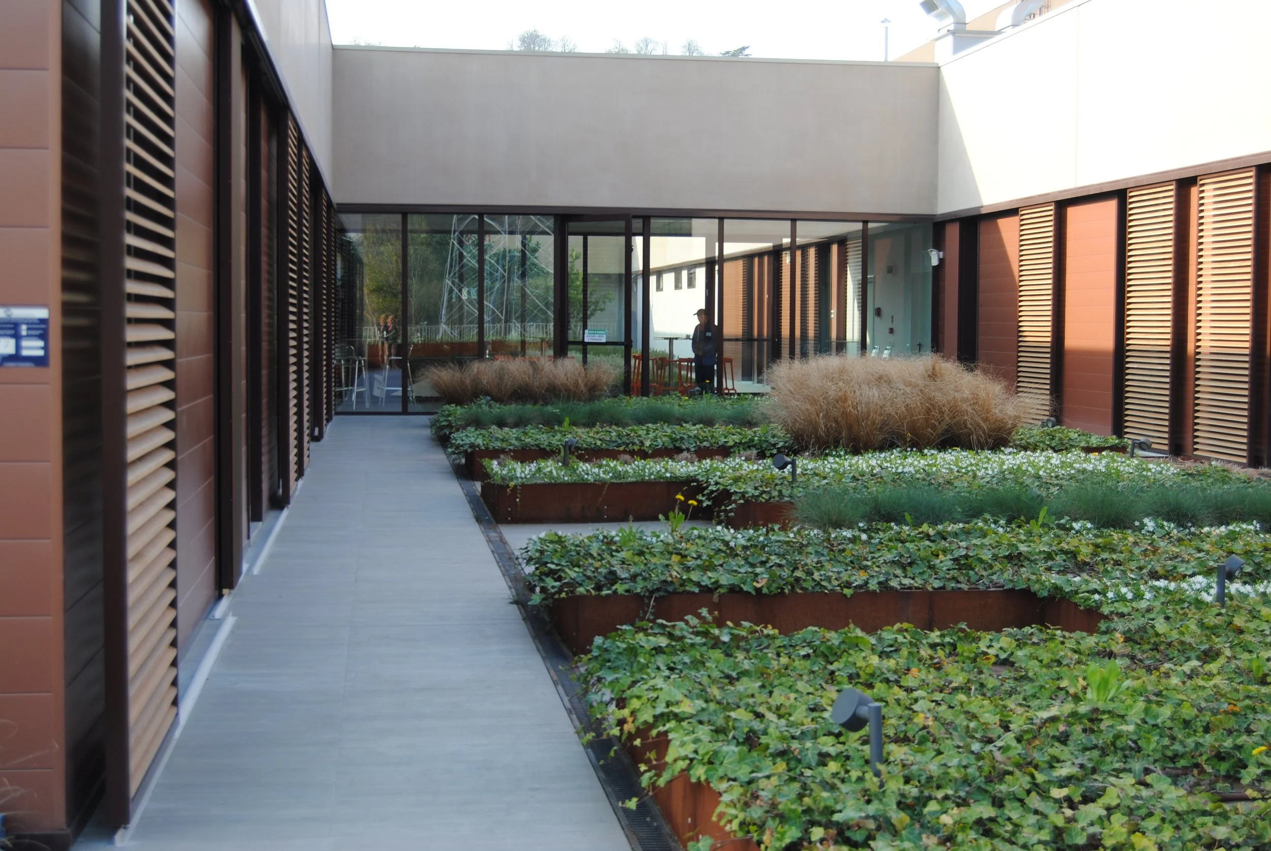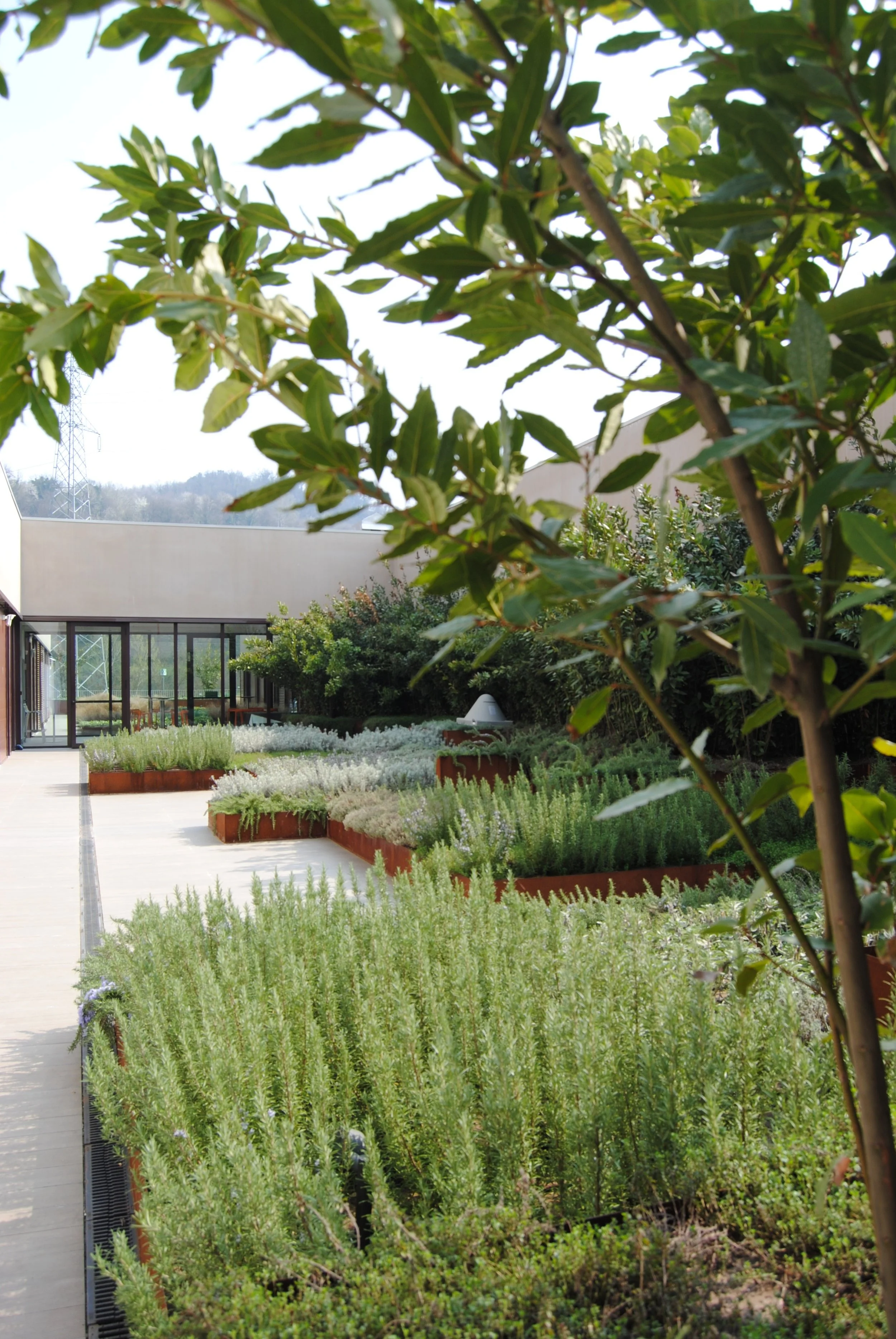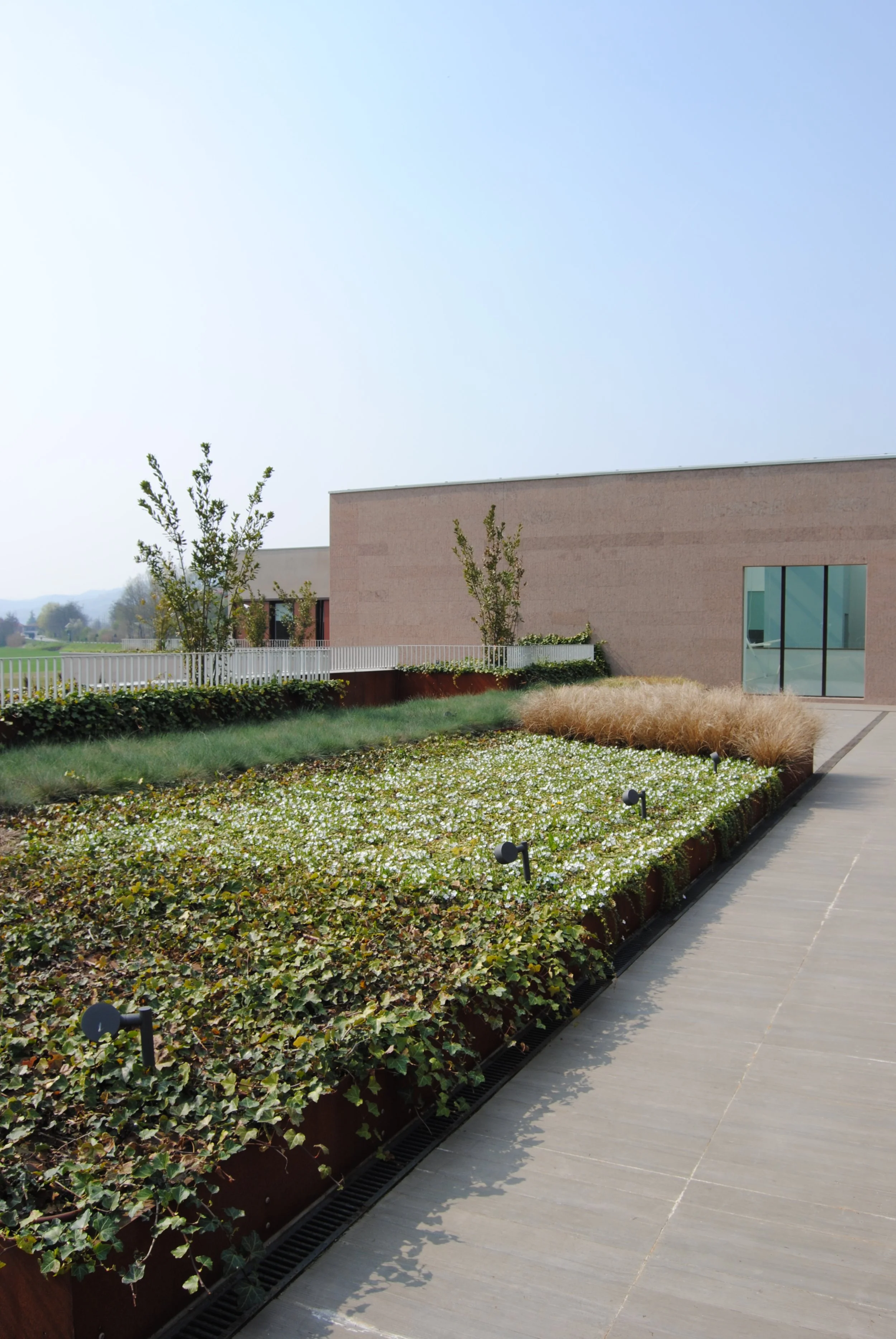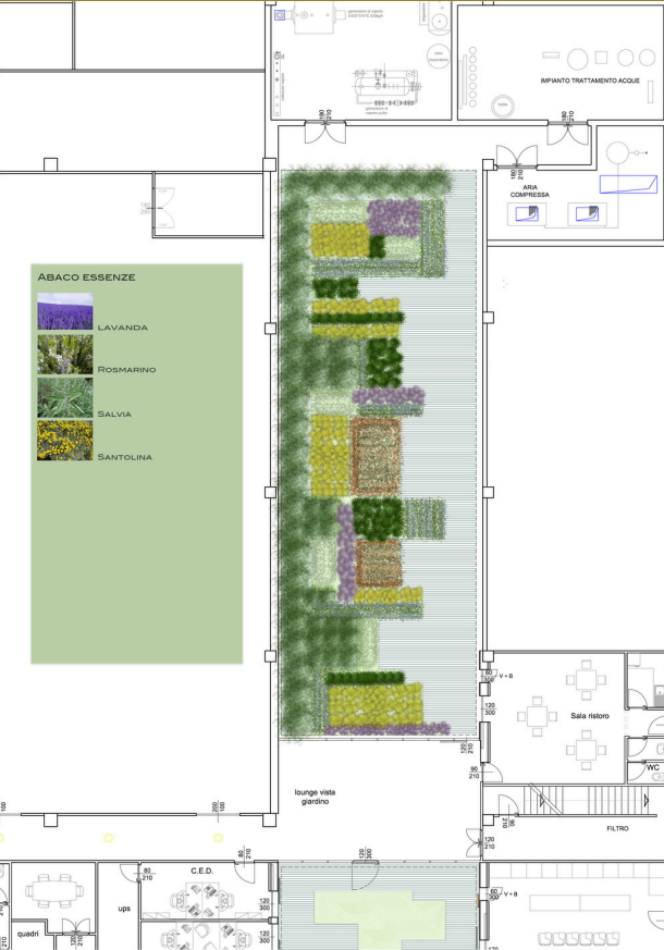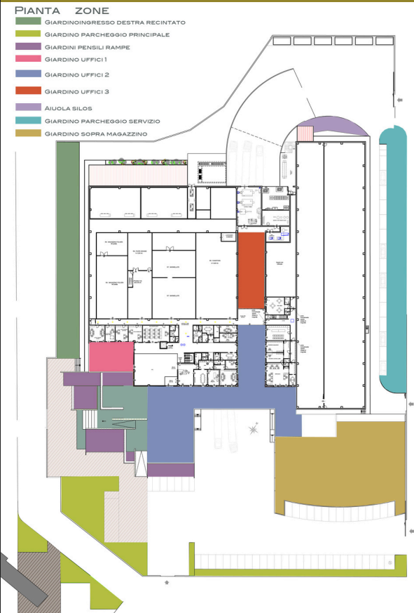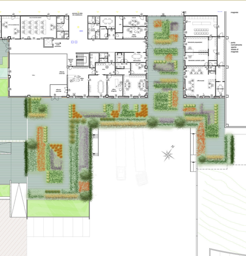 Il giardino aziendale, di ampie proporzioni, è progettato per esprimere attraverso forme e colori l’identità dell’azienda che lo ospita.
