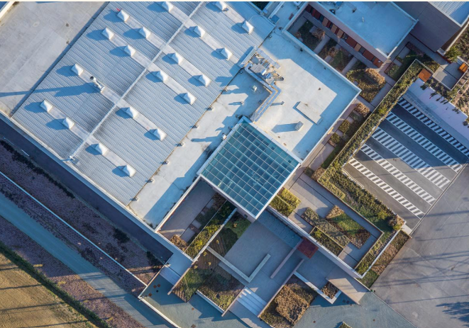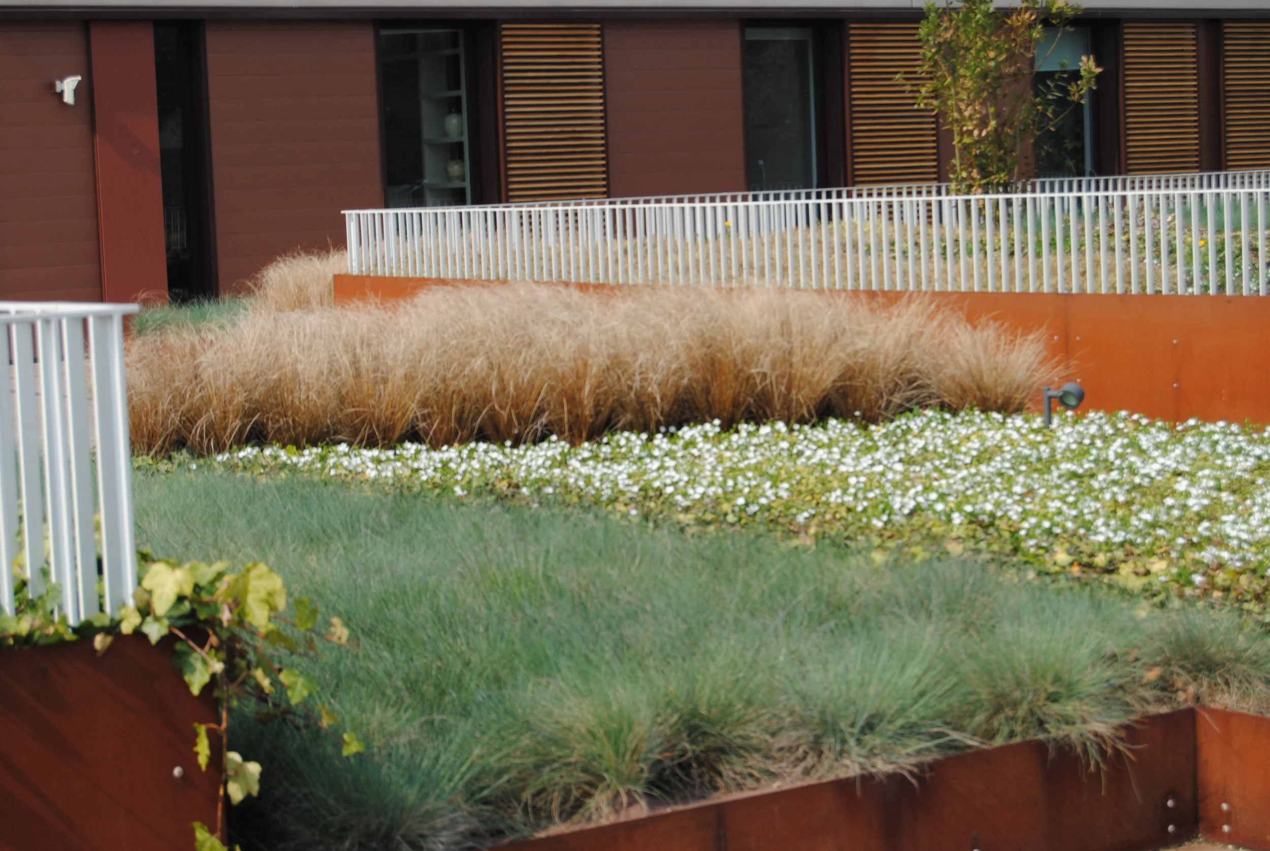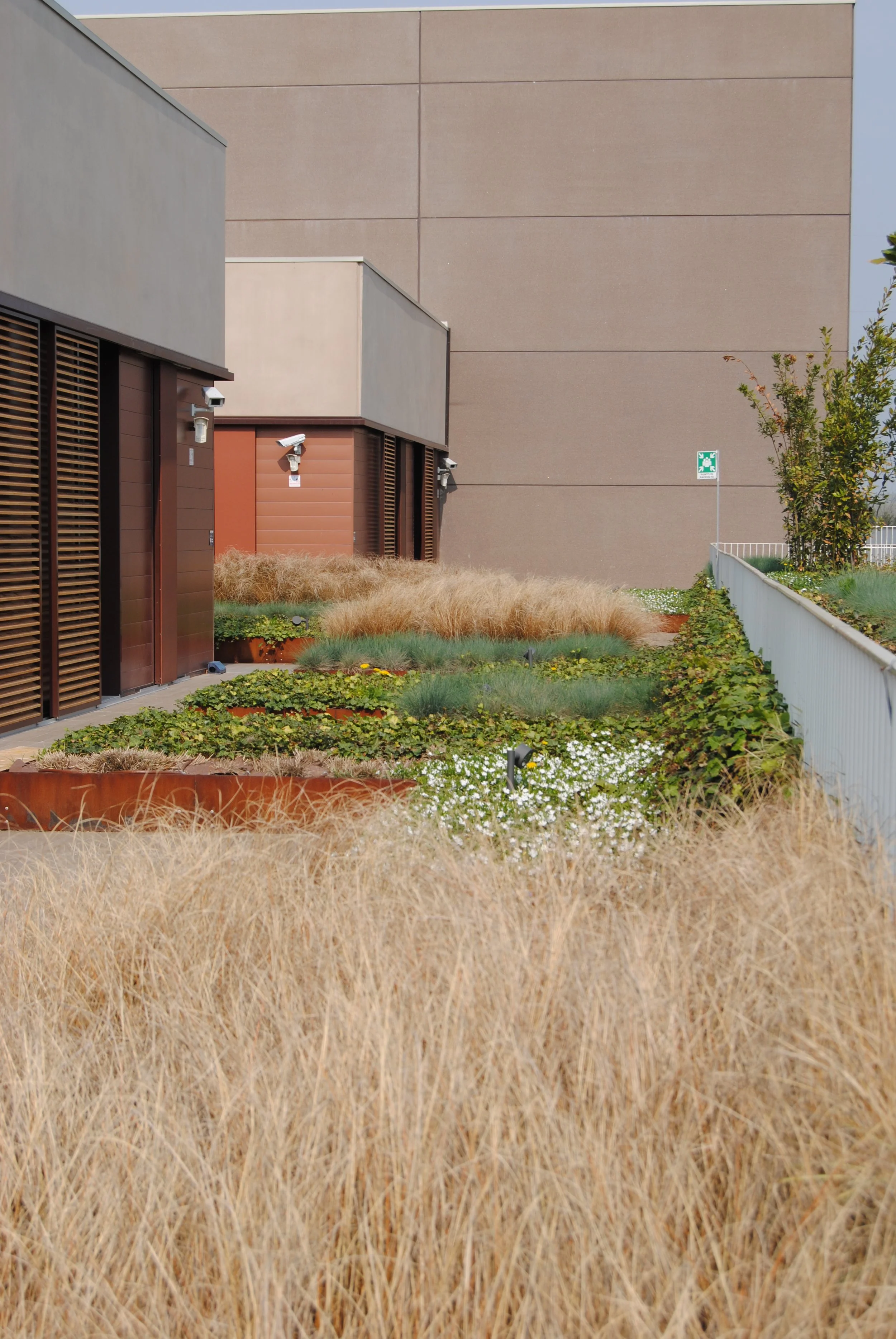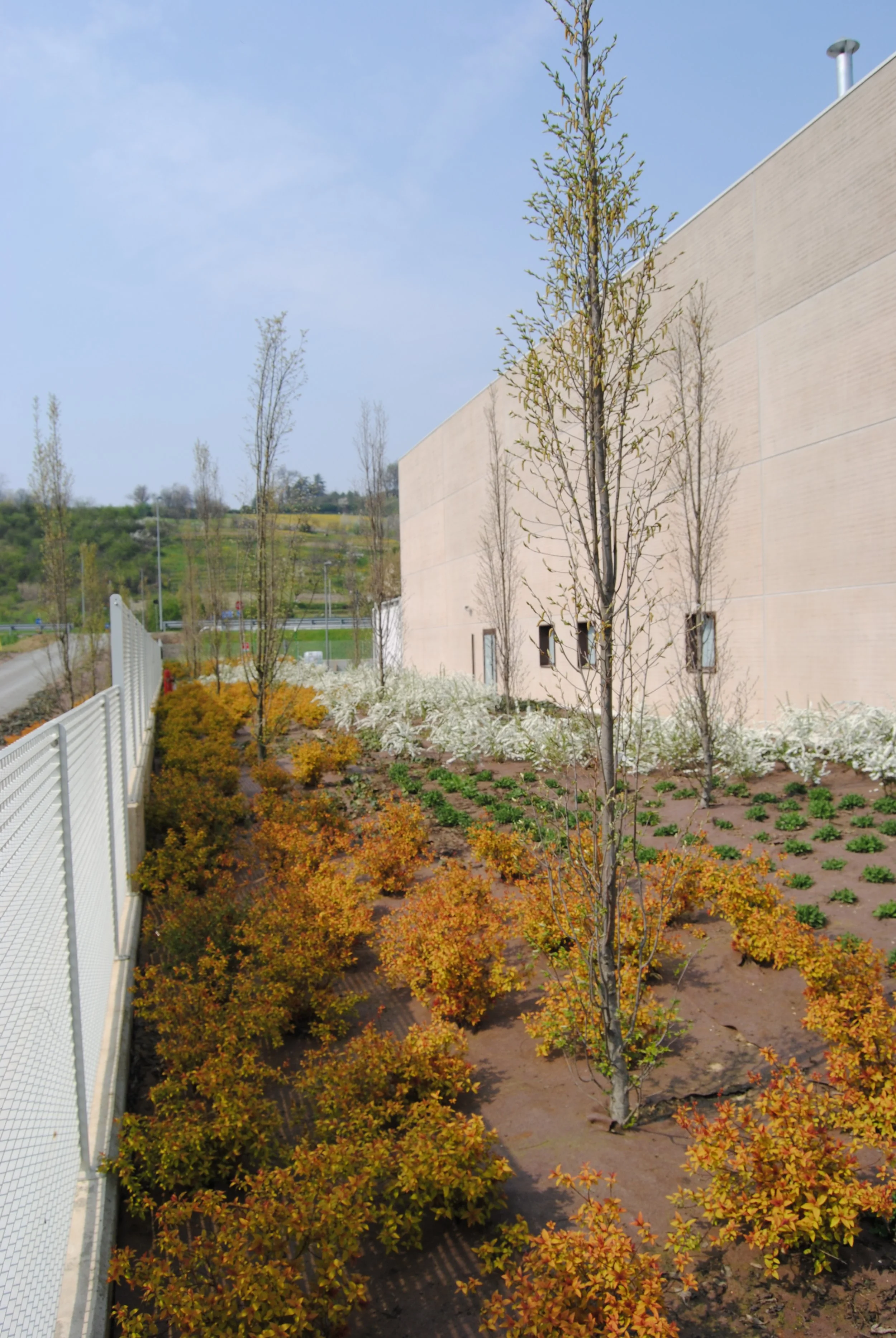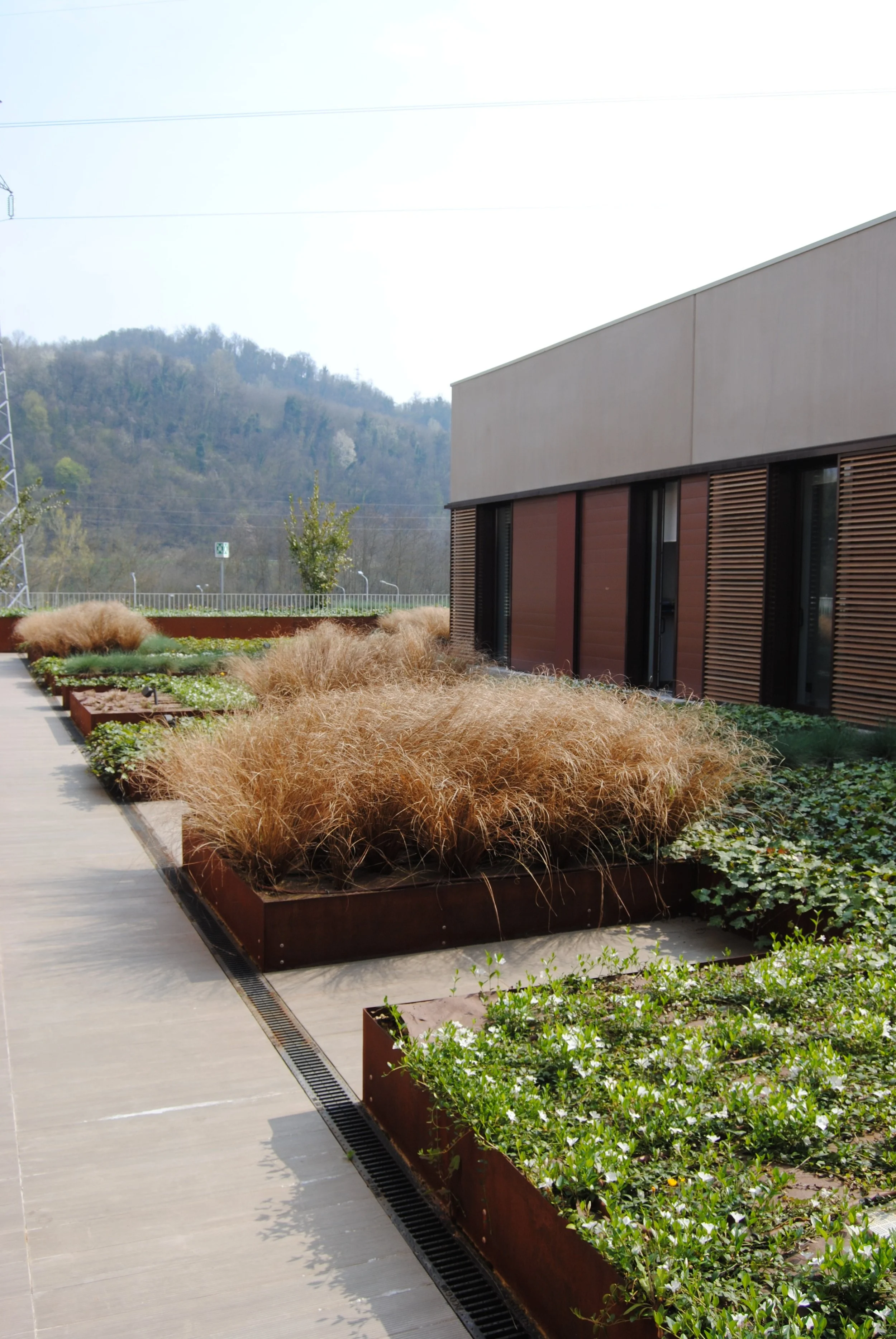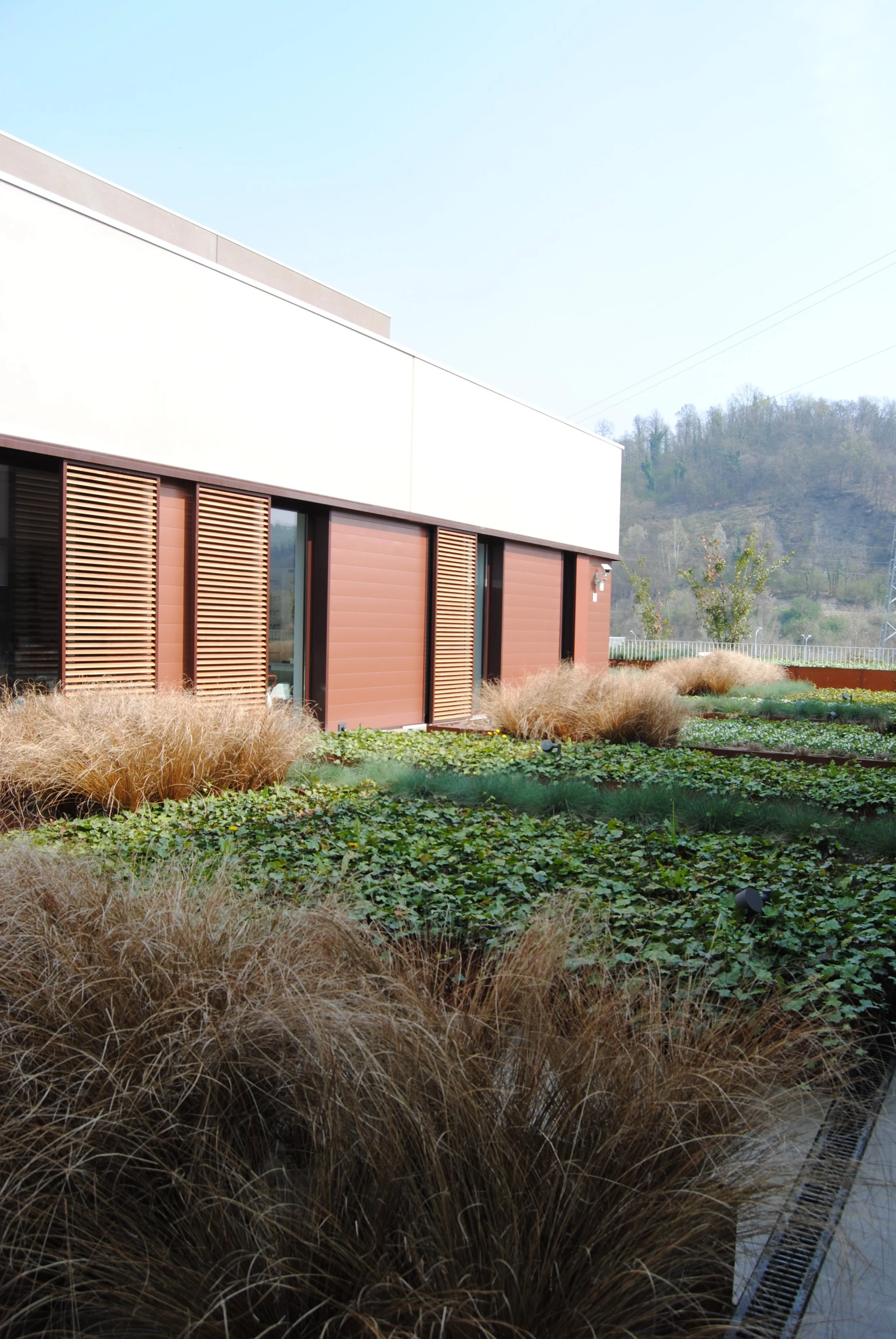 Il giardino aziendale, di ampie proporzioni, è progettato per esprimere attraverso forme e colori l’identità dell’azienda che lo ospita.