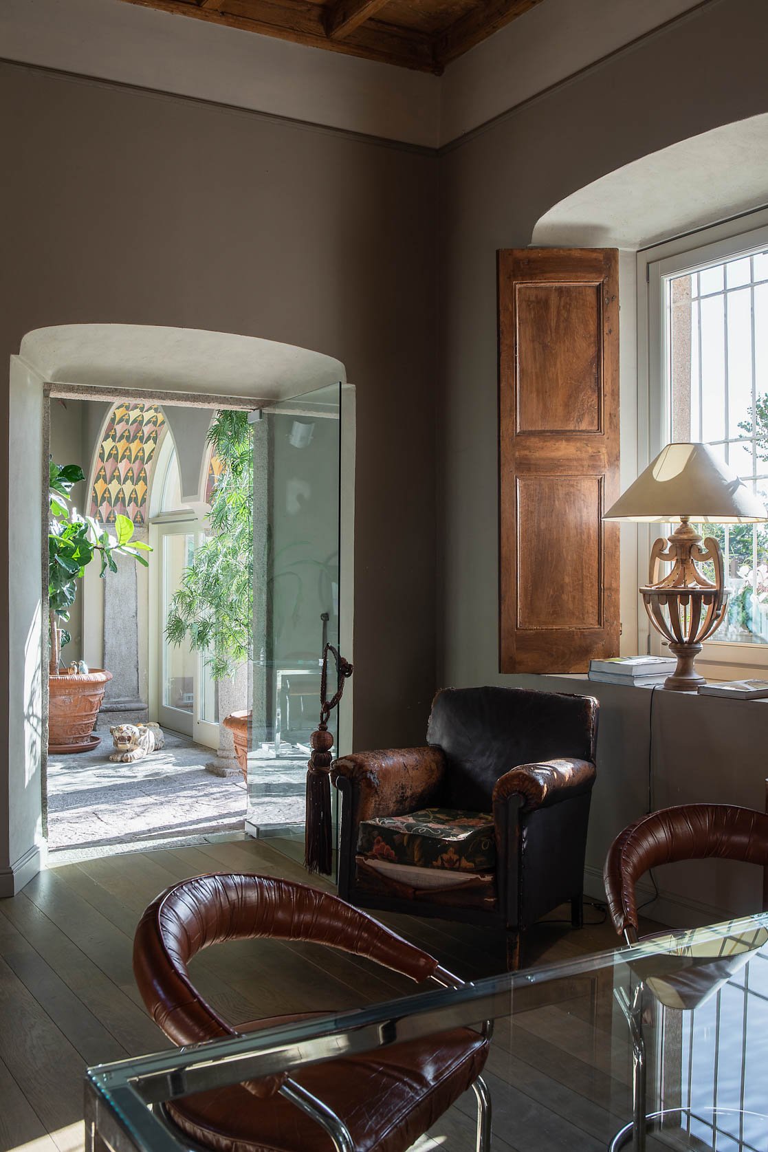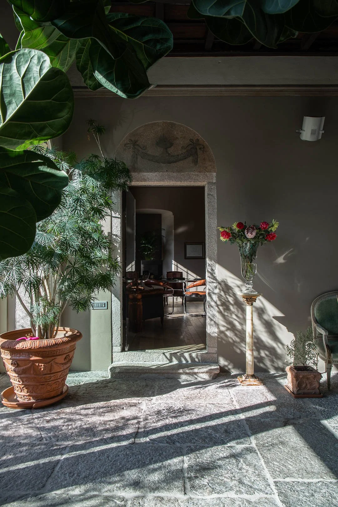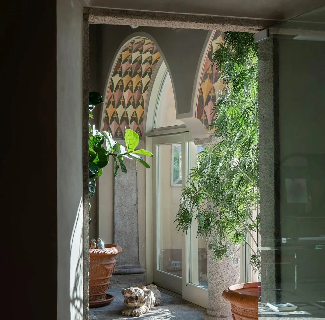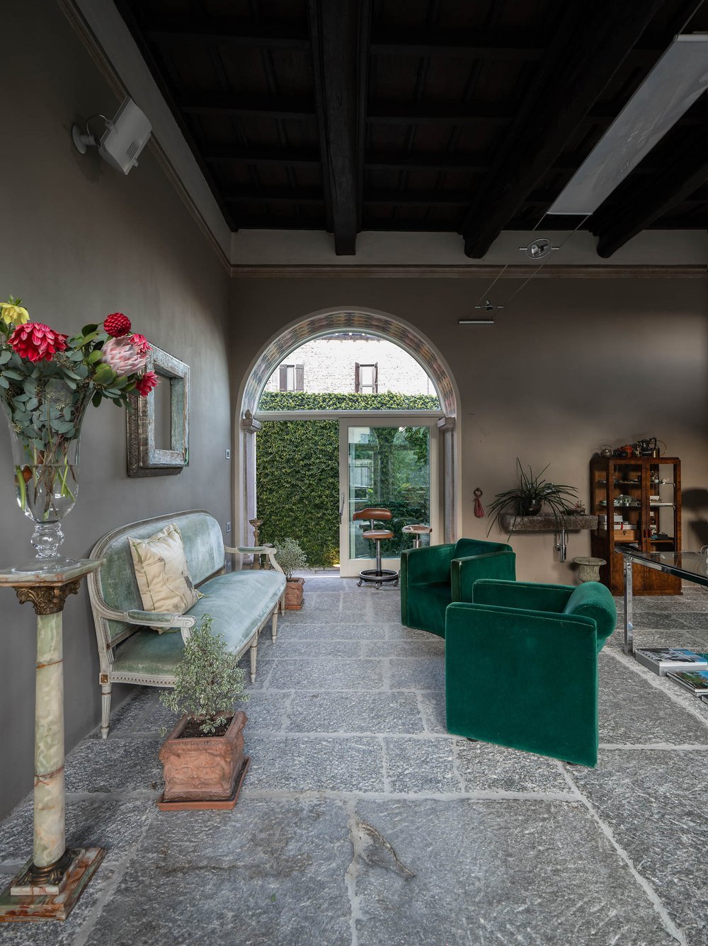 L’imponenza delle piante verdi, integrate negli ambienti, amplifica il senso di profondità e vitalità, trasformando lo spazio in un rifugio creativo, dove natura, storia e progetto convivono in armonia.